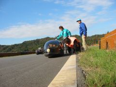 大会役員の人とともにすぐにlucciolaのもとへ向かいましたが、その途中で停車してしまった原因が分かりました。今大会における電気系では、普段は一つしかないブレーカーが二つあり、そのうちの一つが、走行中にoffになってしまったのでした。私と電気主任が現場に着くと、既に走り出す準備は出来ており、念のための車体の確認をおえすぐさまレースへ復帰しました(Fig.2)。回避できた些細なトラブルでしたが、致命的なミスでもなく、実はあらかじめ予想されていたことだったので、「不安」はやや和らぎ、レースへの手ごたえを感じ始めていました。
