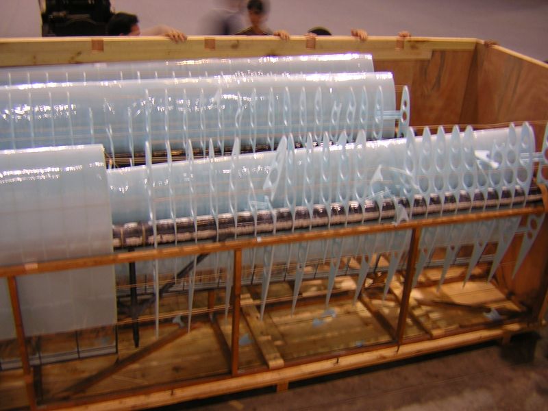 やむを得ず翼を修復しなければならなくなってしまった上に、15日からの公開に間に合わせなければならないので、13日深夜〜14日早朝にかけて徹夜で修復をがんばりました。具体的には左翼側A、Cのリブがそれぞれ10本〜20本、B、Dも数本折れていました。14日7時にはなんとか修復を終えることができました。
