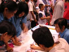 公開が始まると、予想以上の来客数でした。タクシン首相が学生はこの展示会を見に行きなさいという指示を公式に出しているらしく、学校が社会見学の一環として学生を連れてきているようでした。小学生から大学生、なぜかタイ国軍の軍人までが見学に来ました。中にはかなり興味を持ったらしく、2時間近く質問攻めをしてくる学生もいました。やはりタイでは初めて目にするもののようで誰もが驚いていました。参考までに主に聞かれた質問を紹介します。