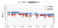 拡大してみてみると時間経過と共にわずかに電圧の降下が見られるが、サーボモータはデータシート上7.2Vあれば動くのであまり気にしなくても良いか。