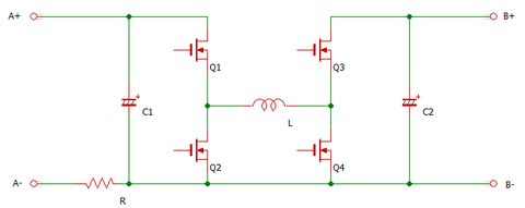 左右対称の形になったことで,4つのFETに加えるPWMのデューティー比を制御することにより,AかBの片方に印加された電圧から,もう片方に0~∞(と言っても回路の制御回路やコンデンサの耐電圧の関係で現実には100V以内)の自由な電圧を出力することが可能になりました.Q1とQ2,またQ3とQ4のゲートにはそれぞれ常に相補PWMのパルスを印加することで無負荷時でも安定した電圧の制御ができ,また電流が左右どちらにも流れることができるようになっています.
